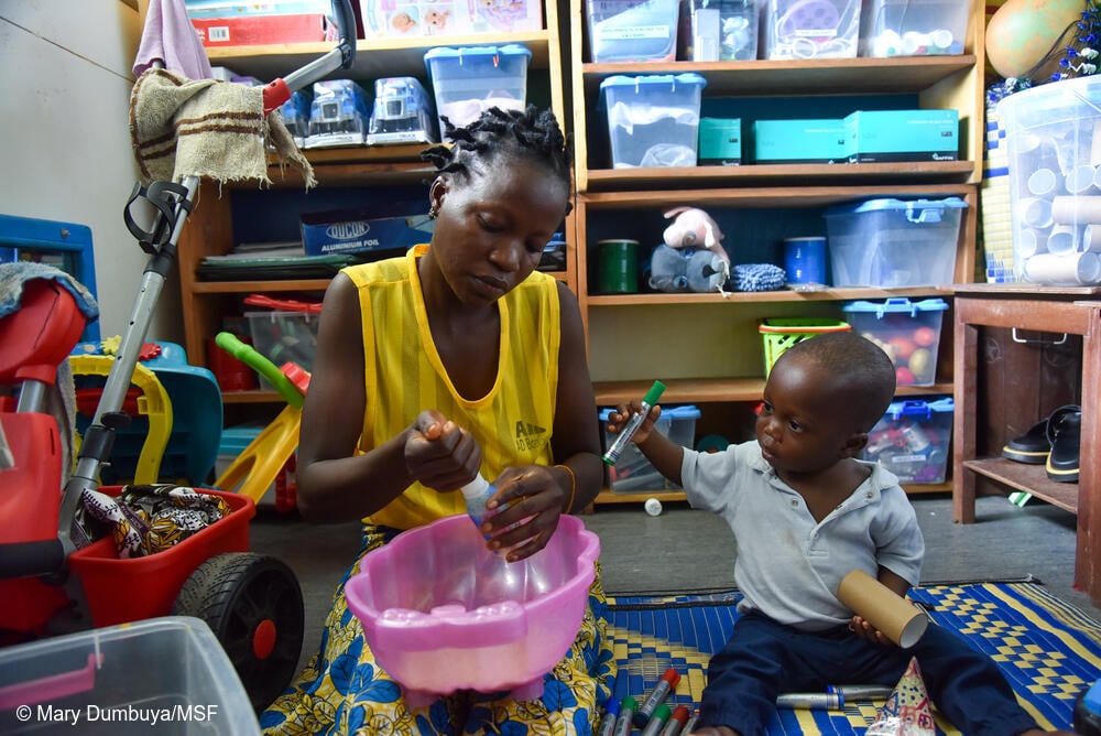 «En el hospital, la terapia de juego comienza con exámenes en las salas y exámenes físicos realizados por el equipo de MSF. Evaluamos a los niños y niñaspara detectar retrasos en el desarrollo, como gatear, caminar o el desarrollo cognitivo y el vínculo con los cuidadores, en función de su edad. A continuación, adaptamos las sesiones de juego para satisfacer sus necesidades específicas».